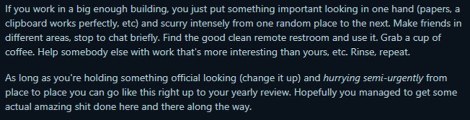 These are examples of DSL behaviour. It’s deceitful, because you are giving your boss the impression that you are working when you aren’t. It’s sycophantic, because you are doing an act for your boss that you think will satisfy them. And it’s lazy, because there’s always something you can do to help the company, but you aren’t.1 Humans doing this are not bad people: they are simply responding to incentives.