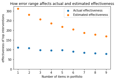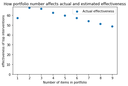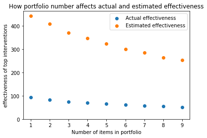 As portfolio size increases, the overestimate decreases, but there is still a substantial overestimate. And if you look at the actual effectiveness of your investment strategy, it goes down as the number of items goes up. If your goal is to maximise expected lives saved, even accounting for the optimizer’s curse the best strategy is still to just pick the top charity.