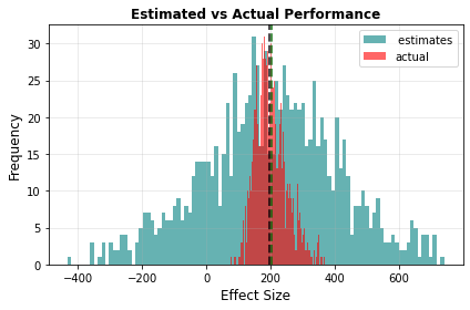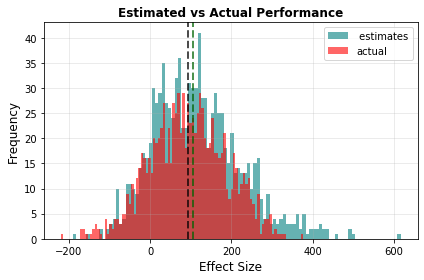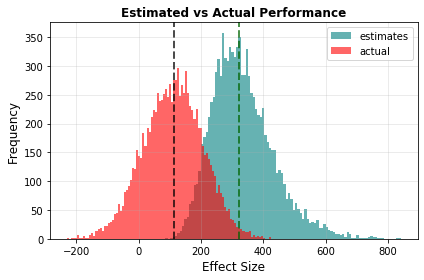 By graphing the performance of the top result over thousands of simulation runs, we can demonstrate the curse in action. In the graph below, the median of the estimates (in teal) is much higher than the median of the actual effectiveness (in red).