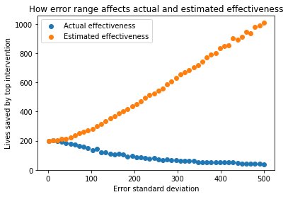This horribly biased error ends up cancelling out the optimizer’s curse, and ensuring that the estimate of the top intervention is spot on. In retrospect, this is actually kinda obvious: with no bias the overestimate of the top charity is around 350 lives, so the bias has to counter this exactly.
