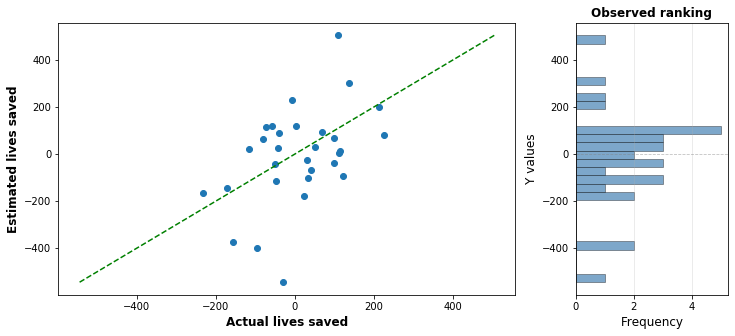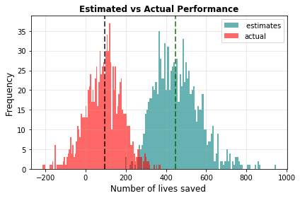 Next, we see the optimizer’s curse in action: the actual lives saved has a median of 111, whereas the median estimated lives saved is 321, a 210 life overestimate:
