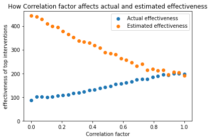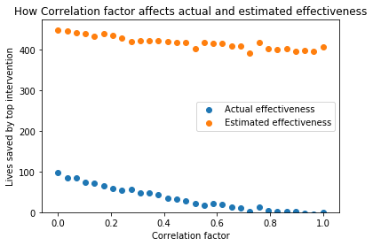Before we leave, it’s worth noting that the sampling of the charities themselves could also be correlated: perhaps there is a Ugandan person on the staff who knows more charities in that country, so Ugandan charities are preferentially picked, which have higher effectiveness on average. This type of correlation would have the opposite effect to error correlation, making the optimizer’s curse worse. I ran the same procedure as above, but applying it to the actual effectiveness rather than the error, and got the following results: