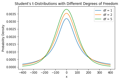 These are students t test curves, with different “degrees of freedom” (DF) factors. An infinite DF value is just a regular normal curve. As DF approaches 1, it approaches a Cauchy curve: a curve with extremely long “tails”. In a long tailed distribution, most of the values are clustered together, but the outlying values are massively higher than regular ones.