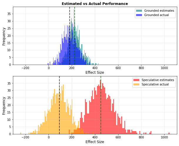 The actual effectiveness of the top grounded charity, in Blue, is about twice that of the top speculative charity. This occurs because each grounded estimate is more trustworthy than each speculative estimate, allowing the ranking of charities to be more accurate and to therefore give us a higher actual result.