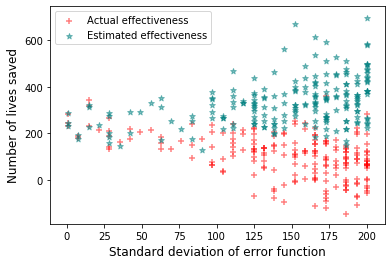 In the next graph, I have visualised how the actual and estimated effectiveness varies as you vary the uncertainty (error standard deviation). We graph the error standard deviation against the median actual and estimated effectiveness over a thousand runs. All other parameters are kept the same as the baseline model: