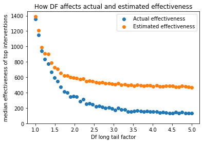 So we can see that as DF decreases, corresponding to long-tailed charity distributions, the magnitude of the optimizer’s curse decreases, to the point where estimates match with actual effectiveness pretty well.